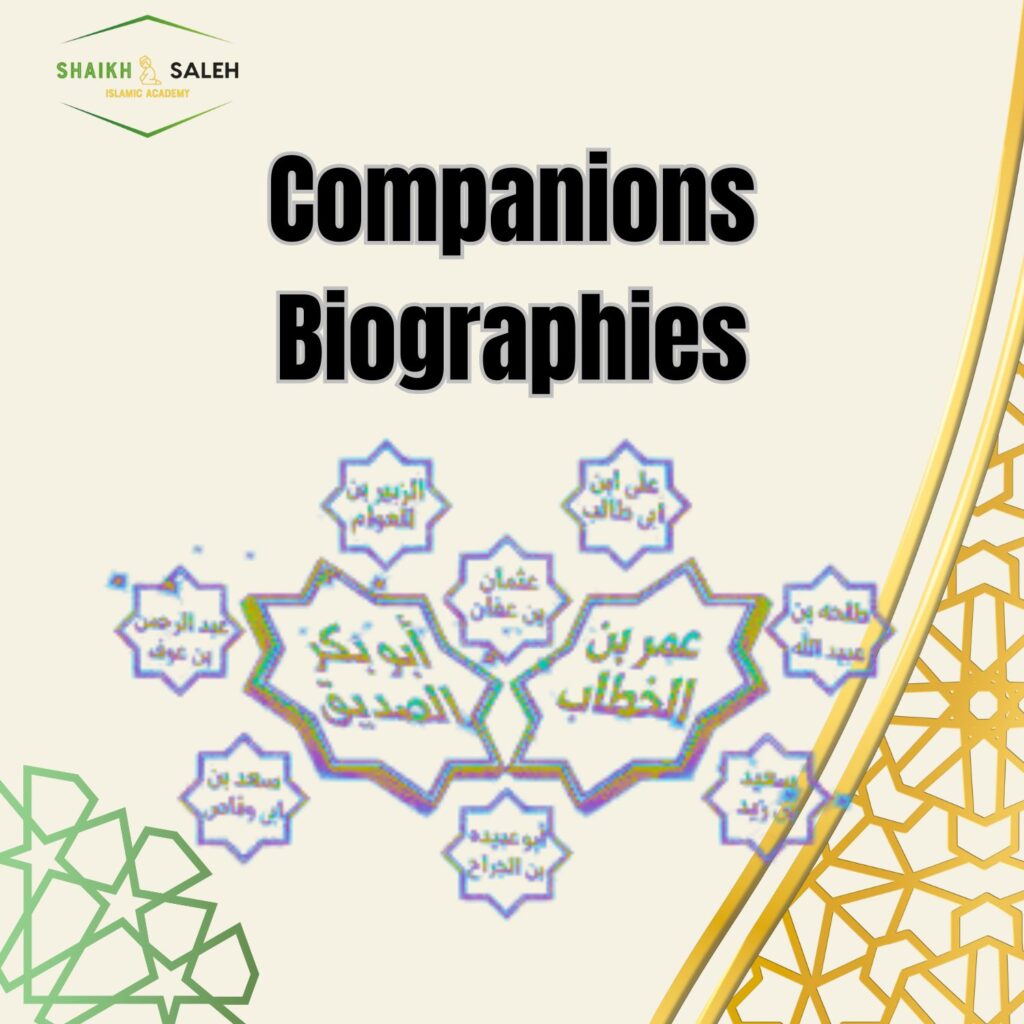 The Companions Biographies course is an in-depth study of the lives of the Sahabah (may Allah be pleased with them), who are the unique generation that was raised by the Prophet Muhammad PBUH. This course aims to shed light on their biographies, their sacrifices, and their great contributions in serving Islam, so that they may be models and role models for Muslims after their Prophet.